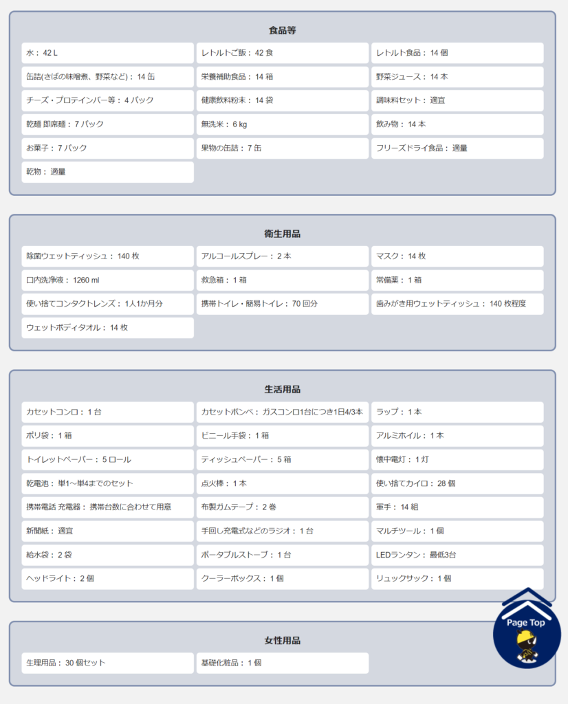 (例)夫婦2人暮らしの場合の備品リスト(7日分)