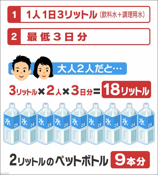 非常食は最低限3日分、水は1日ひとり3リットルを原則として最低限3日分。いずれも、できれば1週間分を用意しておくよう推奨されています。